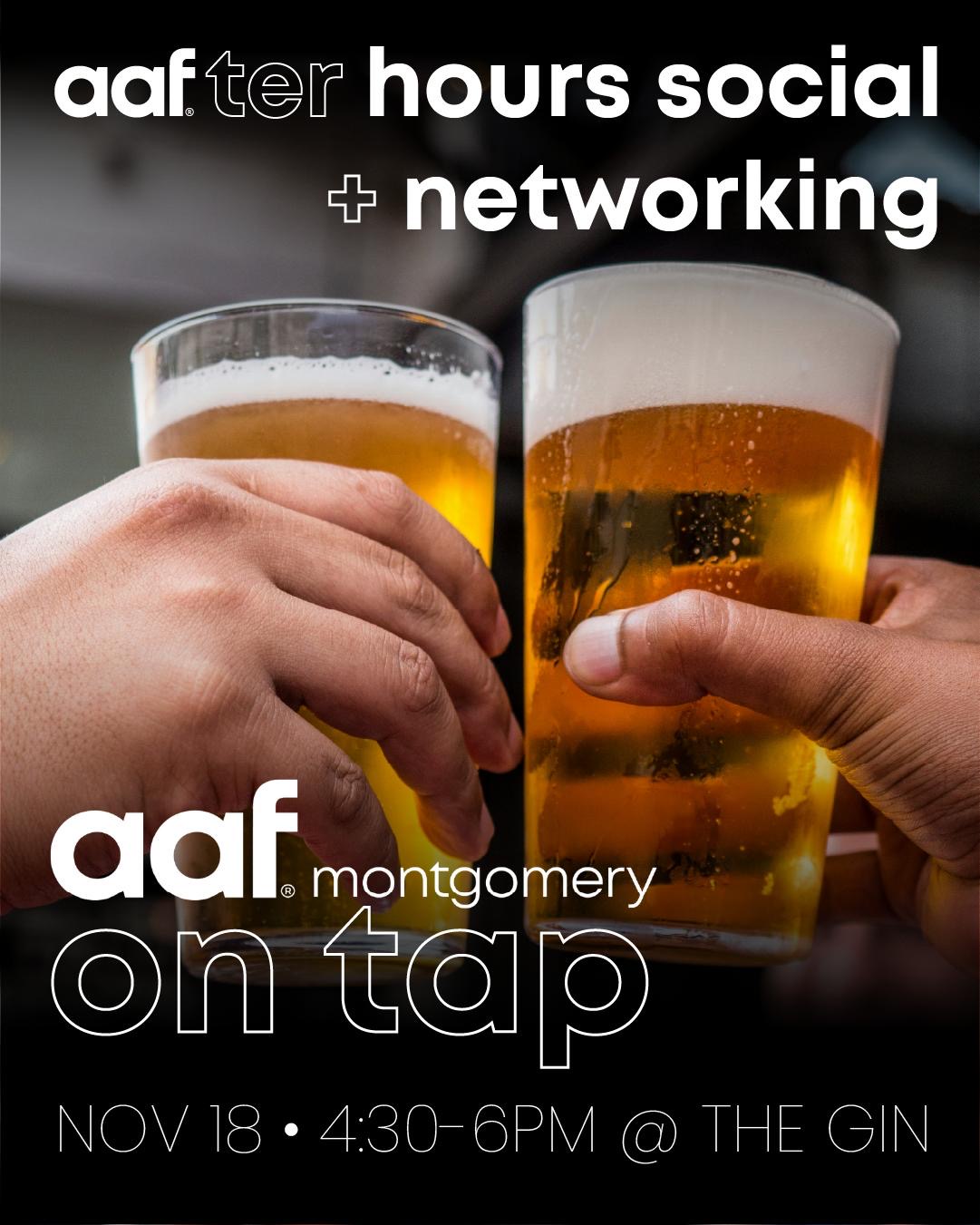 The Gin 9100 Eastchase Parkway Suite E, Montgomery, Alabama, United StatesJoin us for AAF on Tap, an informal evening social designed to connect the local creative community. We’ll meet at The Gin on November 18 from 4:30–6:00 PM. Come for the conversation, stay for the connections—and enjoy a cocktail in a relaxed setting. Bring a colleague or friend; the more, the merrier. Register here: https://aaf-montgomery-6837589ea09e1.springly.org/collect/description/632953-c-aaf-on-tap